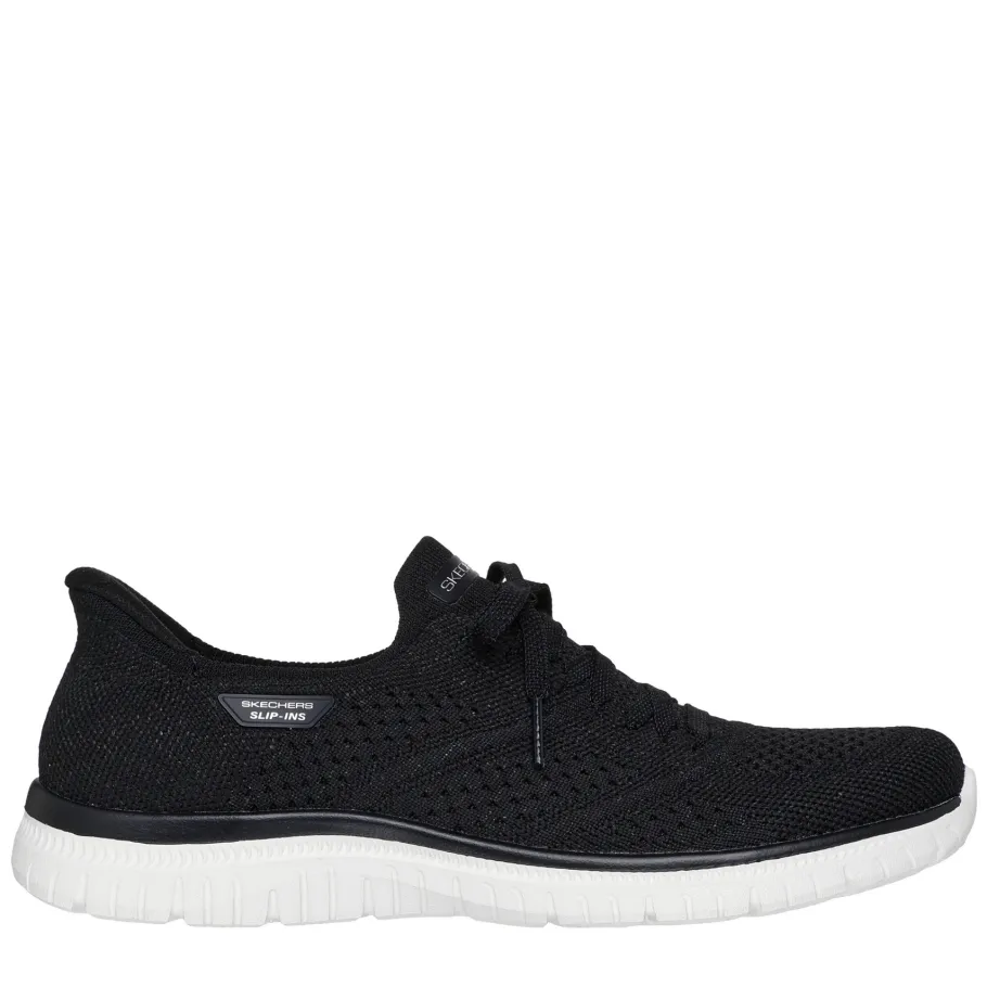 saGlide into absolute comfort with the Skechers Hands Free Slip-ins® : Virtue – Flawless. Designed with our exclusive Heel Pillow™ cushioning, this vegan model offers a Stretch Fit® stretch-knit upper with fixed laces, plus a Skechers Air-Cooled Memory Foam® insole for optimal comfort.