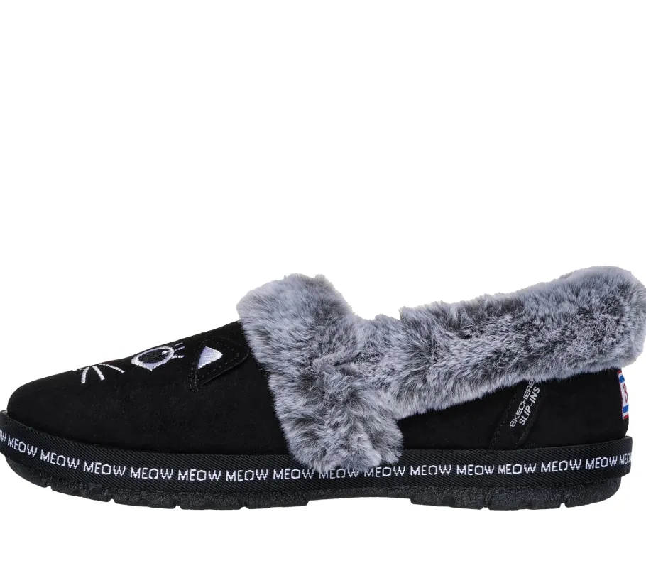 This casual slip-on features a vegan suede upper adorned with a 3D embroidered black cat face, faux fur trim and a Skechers Memory Foam™ insole for cozy comfort with every step.