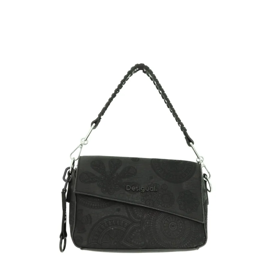 This black handbag from Desigual combines sobriety and originality thanks to its tone-on-tone floral or mandala motif, subtly embossed on the flap and body of the bag. Its classic rectangular shape is enhanced by modern details, making it a versatile accessory for all occasions.