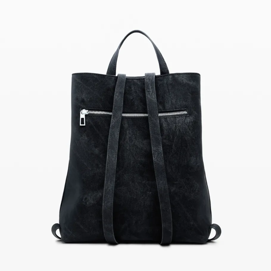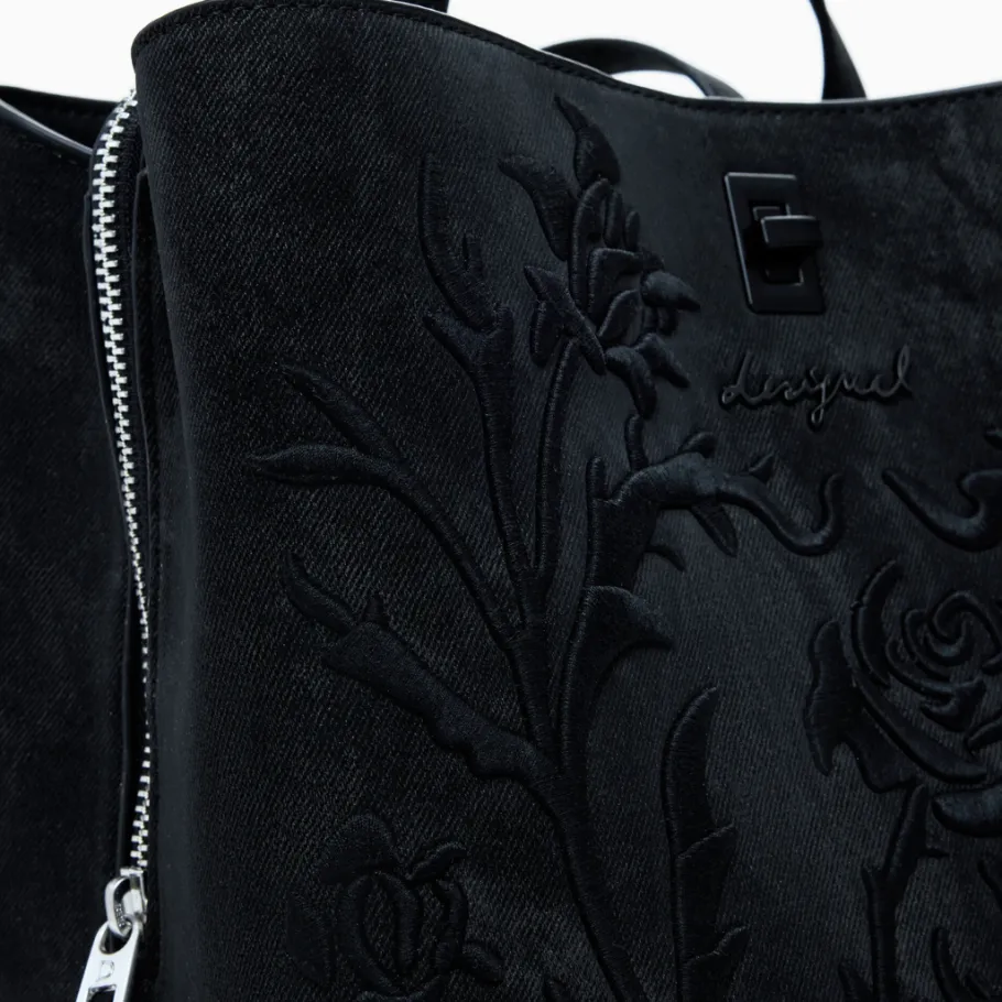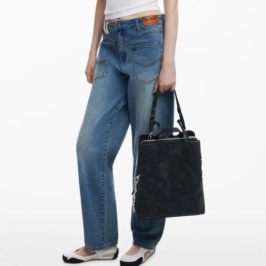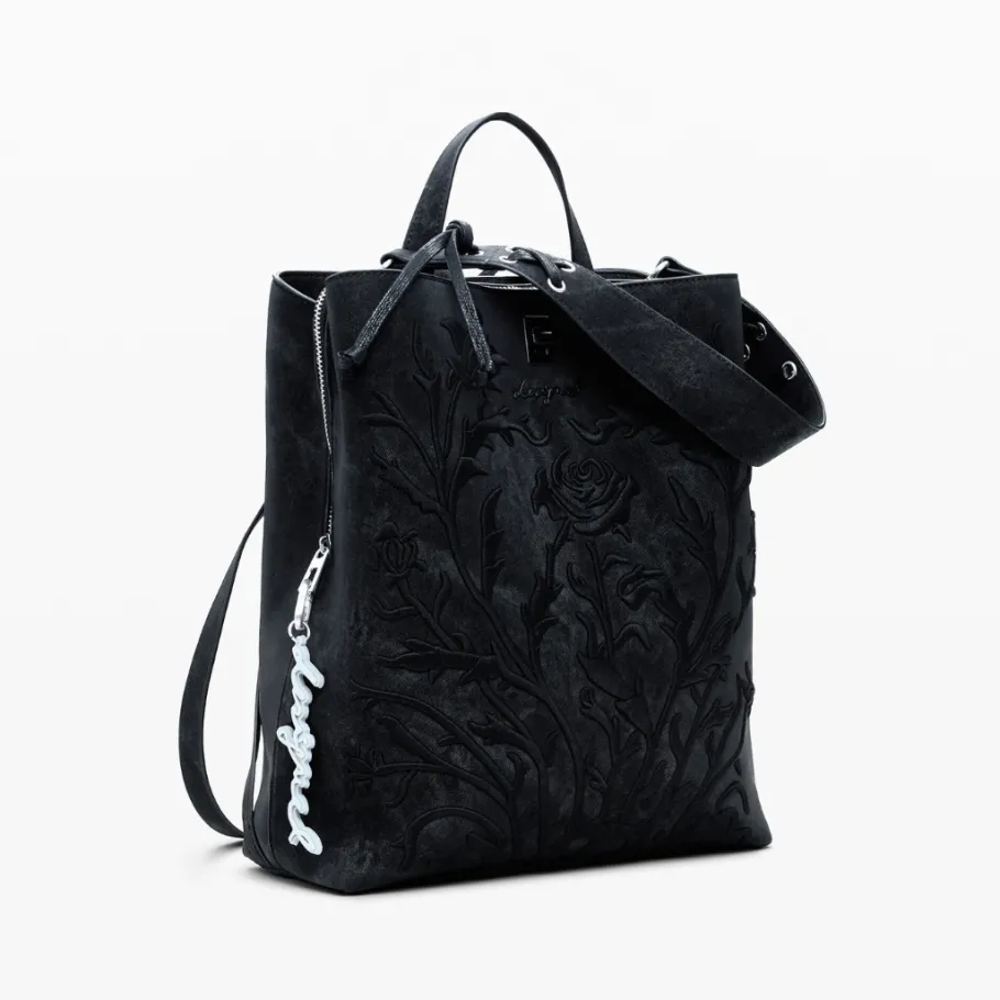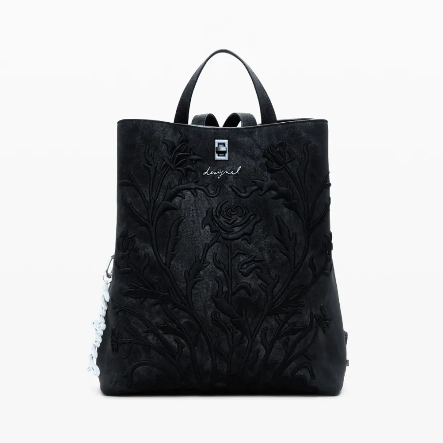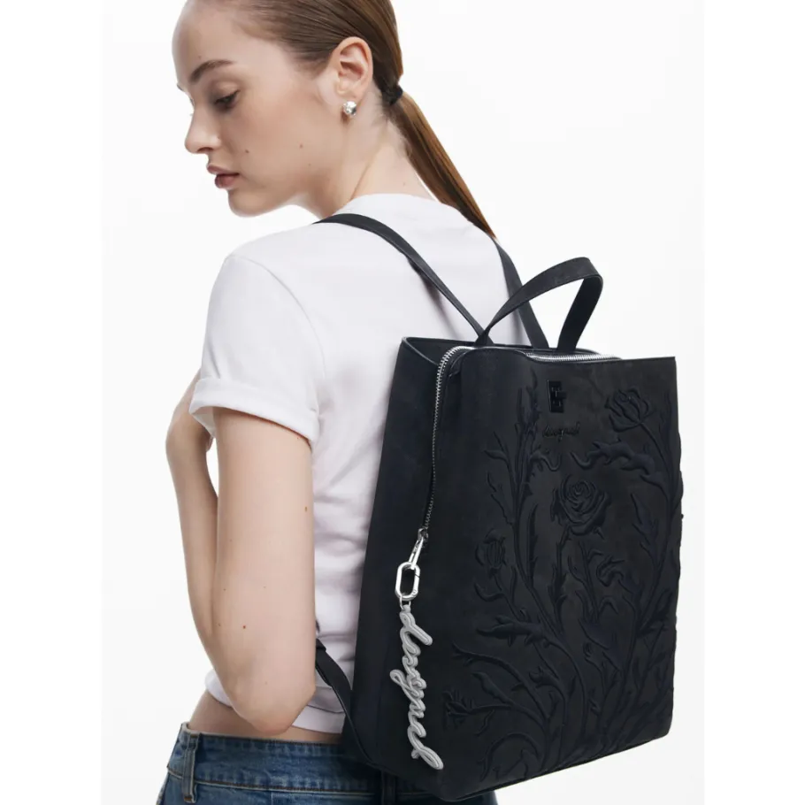 Small faux-leather backpack adorned with 3D embossed flowers, with exterior back pocket and several interior compartments.