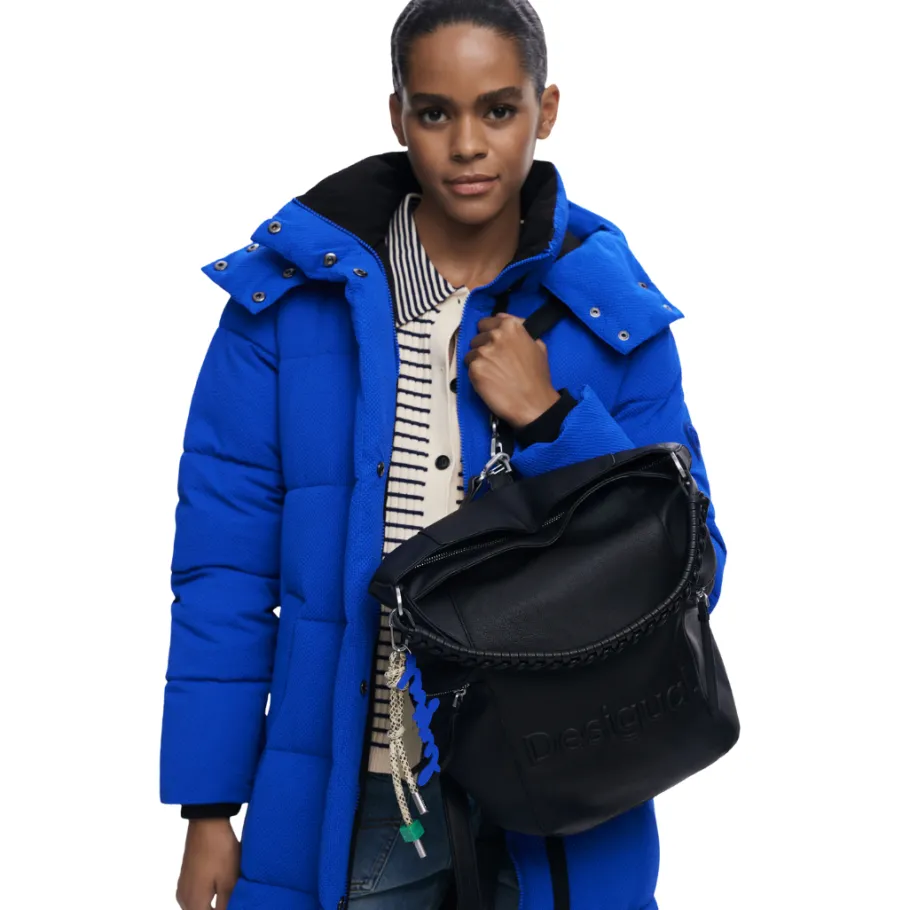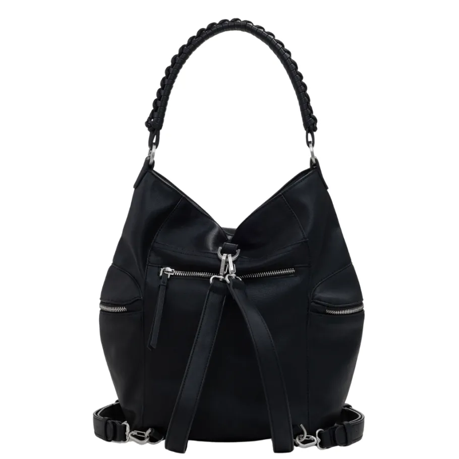 Large faux-leather backpack with 3D embossed logo, zipper closure and removable straps for conversion into a bag.