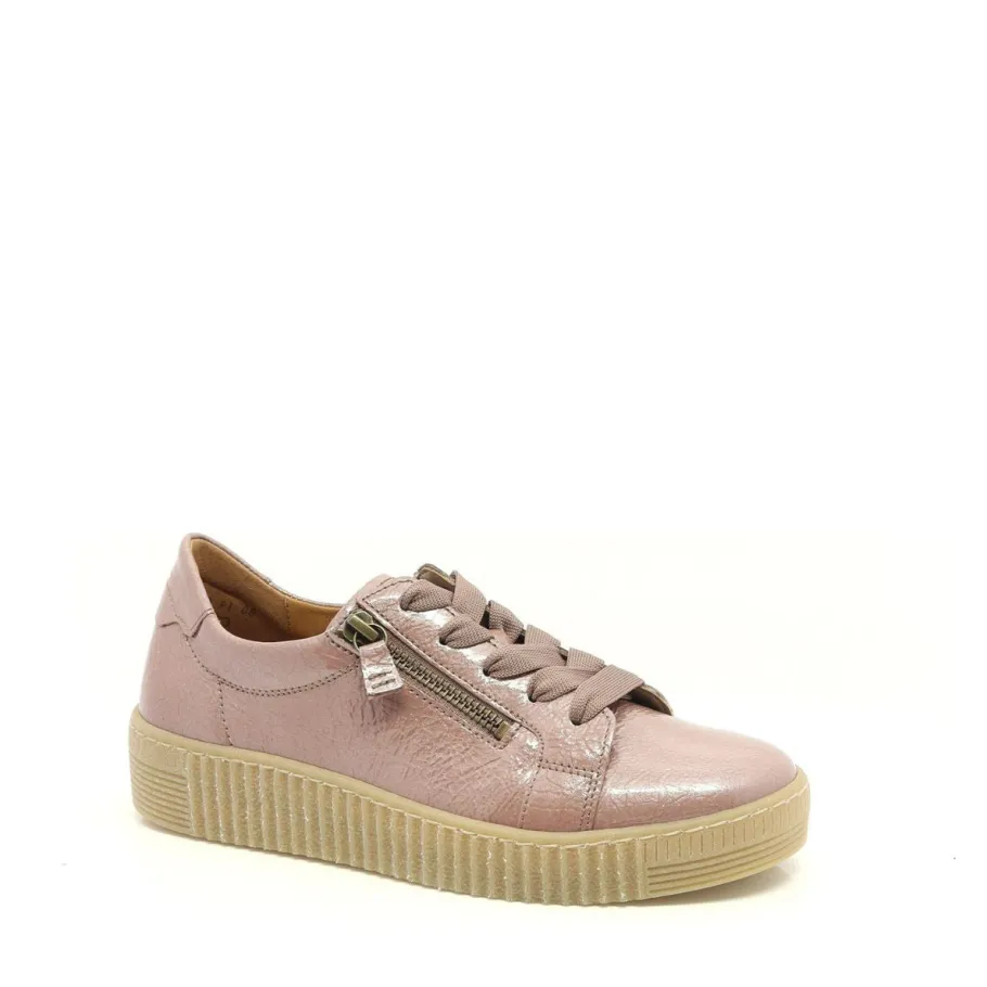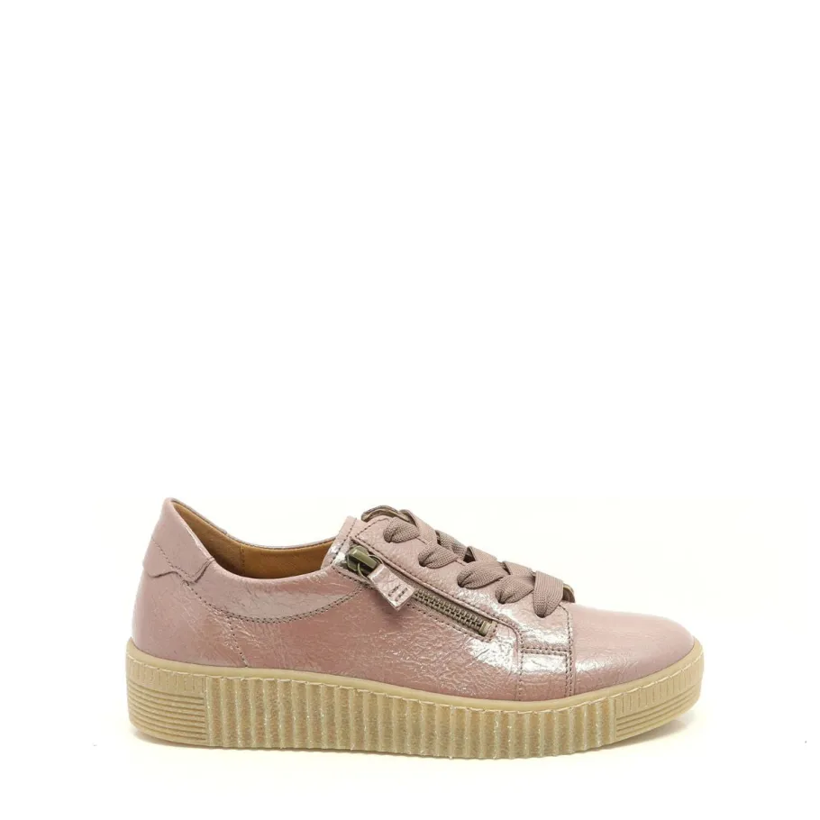 Combine style, comfort and responsibility with this trendy Gabor platform sneaker. Crafted in resource-efficient tan patent leather, it features a textured finish, wide tonal laces and a practical side zipper. Its removable insole, with cushioning made from recycled materials from Gabor’s own production, offers enhanced comfort while remaining sustainable. Easy to remove, it also allows the use of orthopedic insoles or offers more volume depending on your needs. The genuine leather lining ensures a breathable, foot-friendly environment, while the 3.5 cm platform sole discreetly elongates the silhouette.