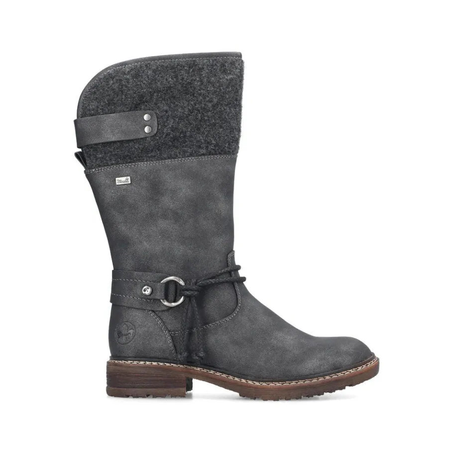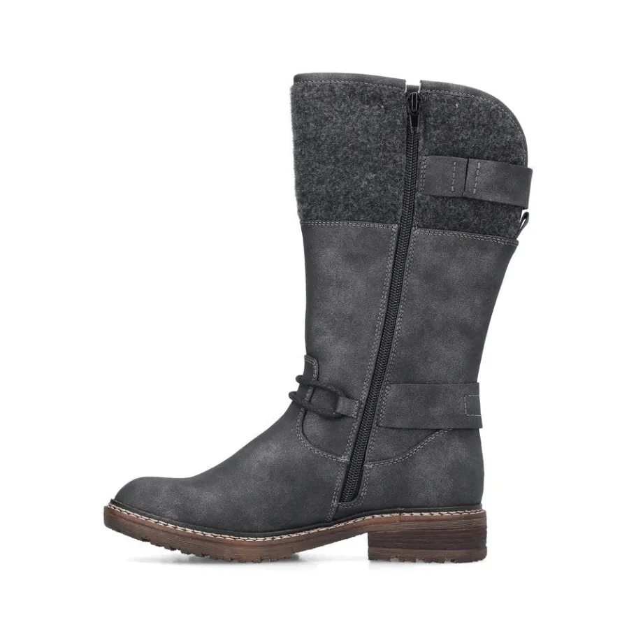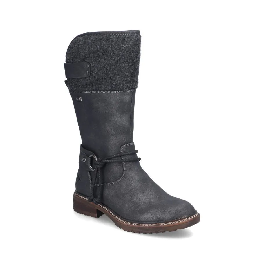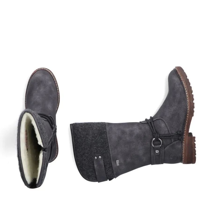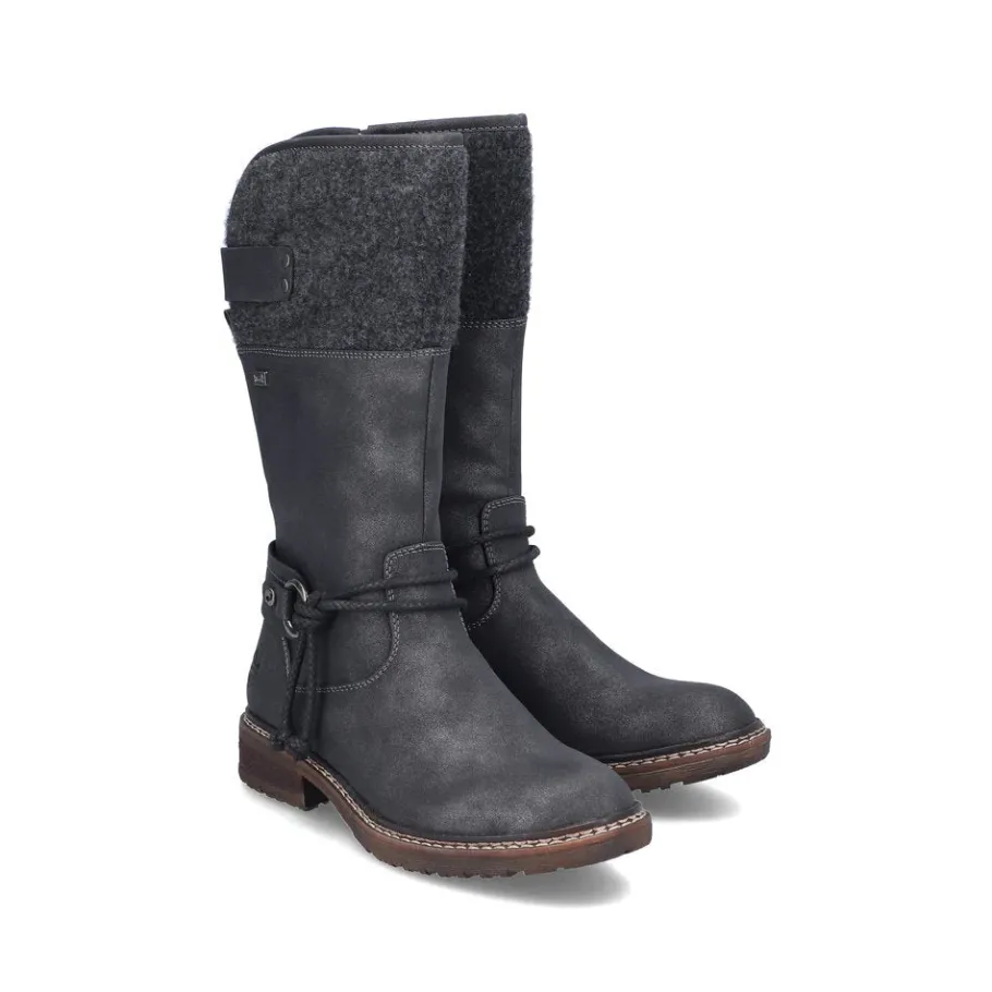 Cold weather doesn’t stand a chance! These asphalt-black Rieker high boots are carefully crafted. A side zipper makes them easy and comfortable to put on. The decorative black strap on the side adds a touch of originality. These boots feature a sturdy lug sole, offering excellent grip for sure-footed stepping. The warm, plush lining offers long-lasting protection against the cold, while the water-repellent upper protects against moisture and wind. Pure luxury!