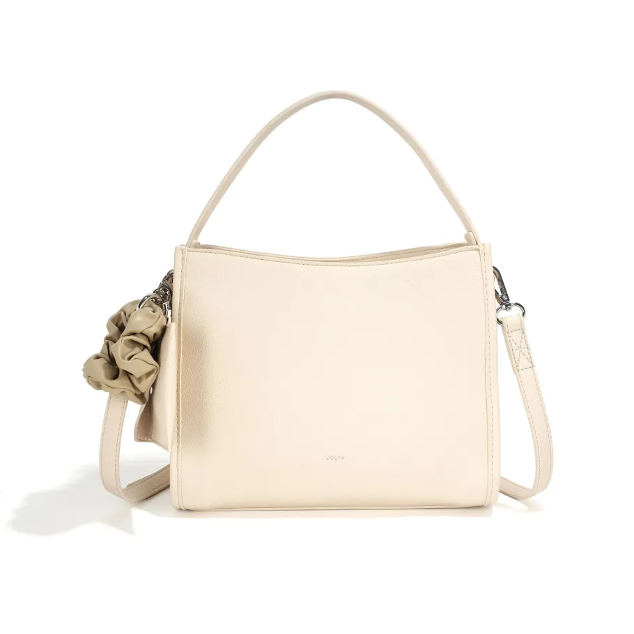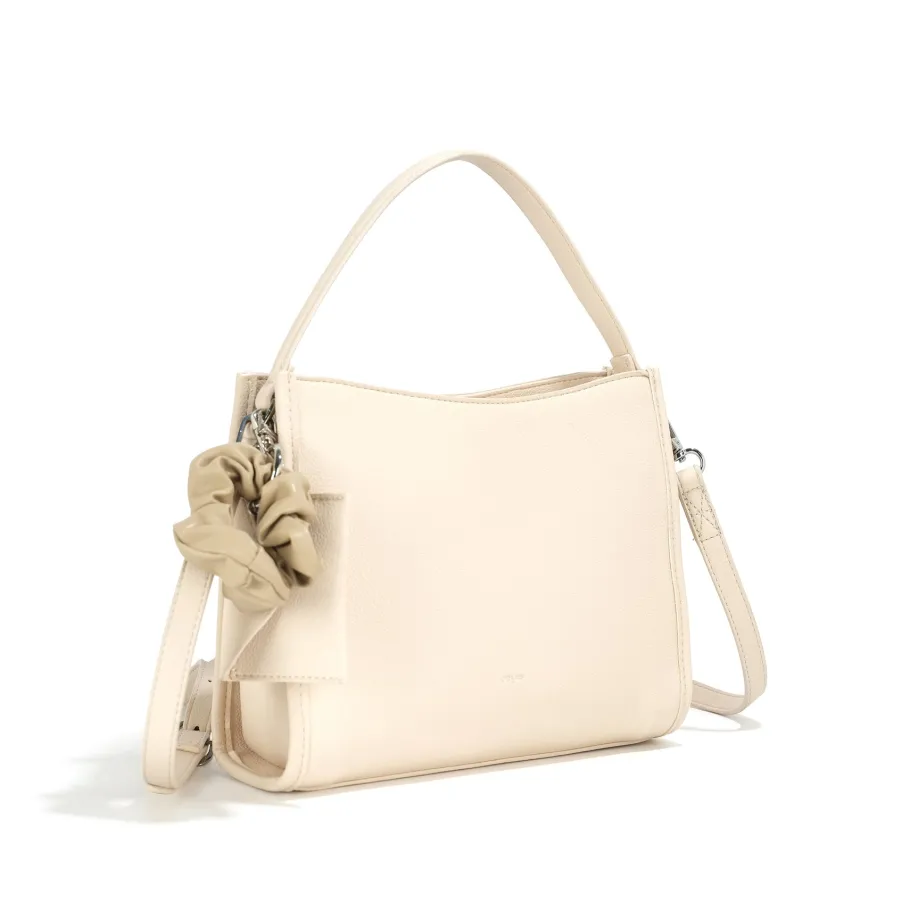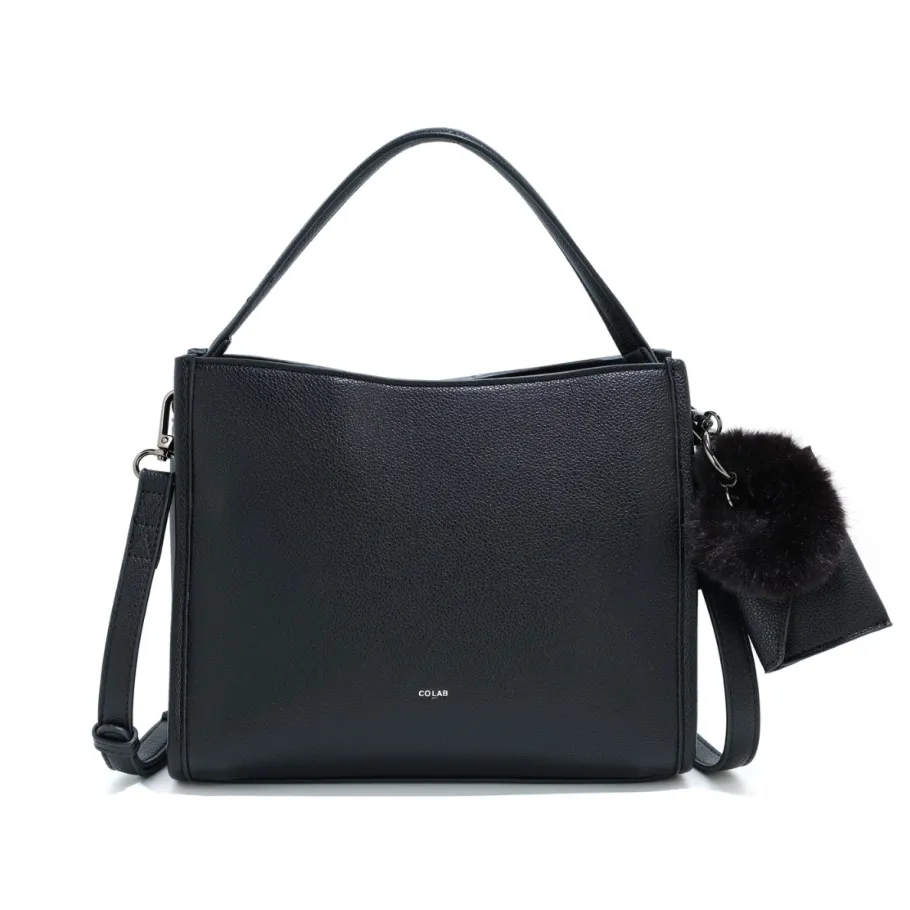 A compact top-handle shoulder bag with a vegan fur scrunchie and a card holder for its ornaments.