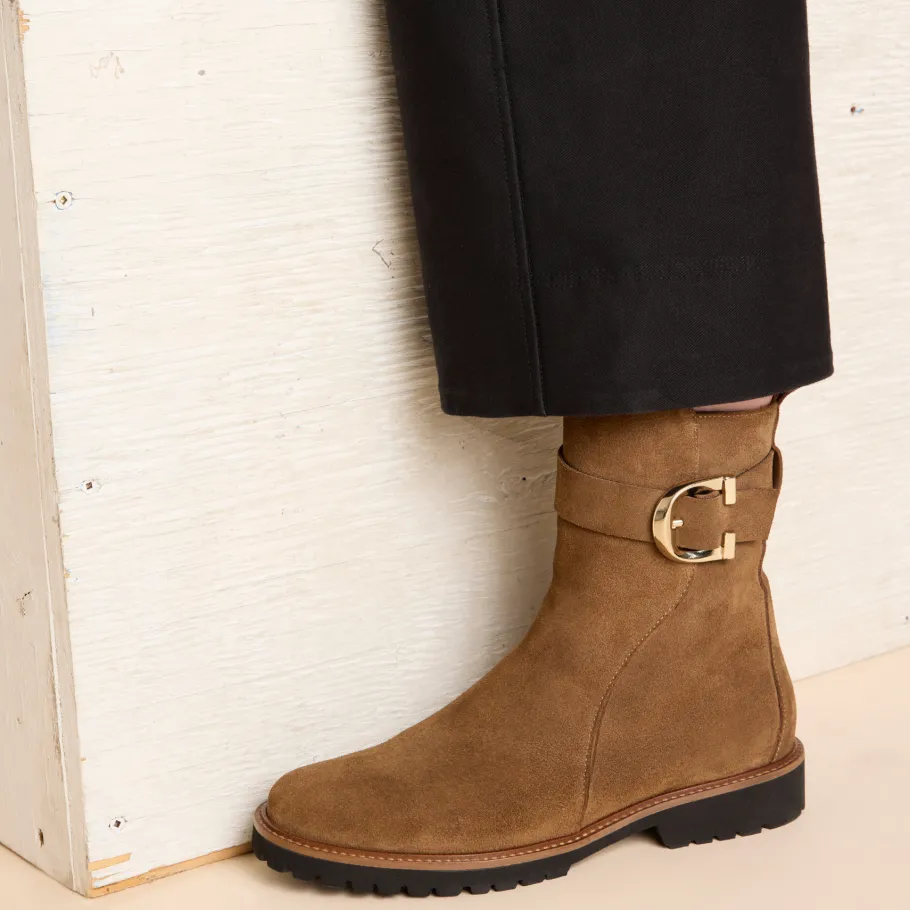 CLOE ankle boots by Apropo are the embodiment of Italian elegance combined with everyday comfort. Crafted in top-quality suede leather, they feature a sleek design sublimated by a refined metal buckle strap.