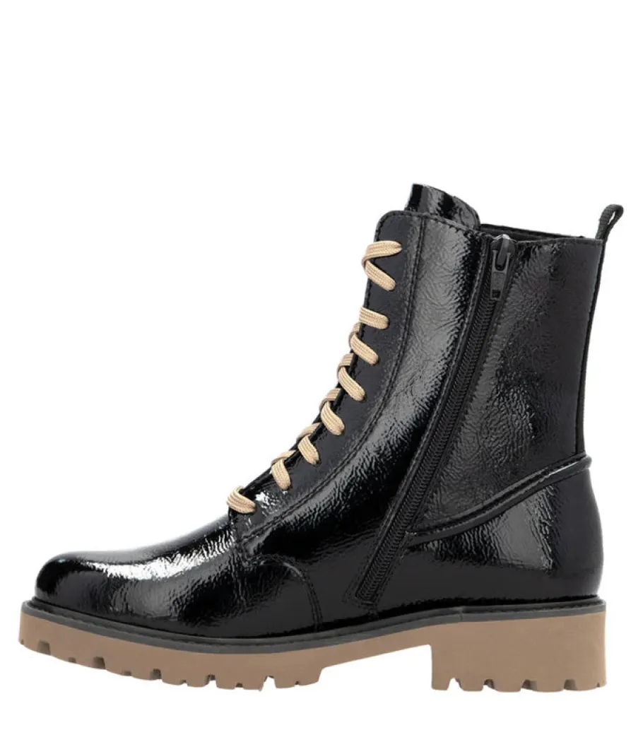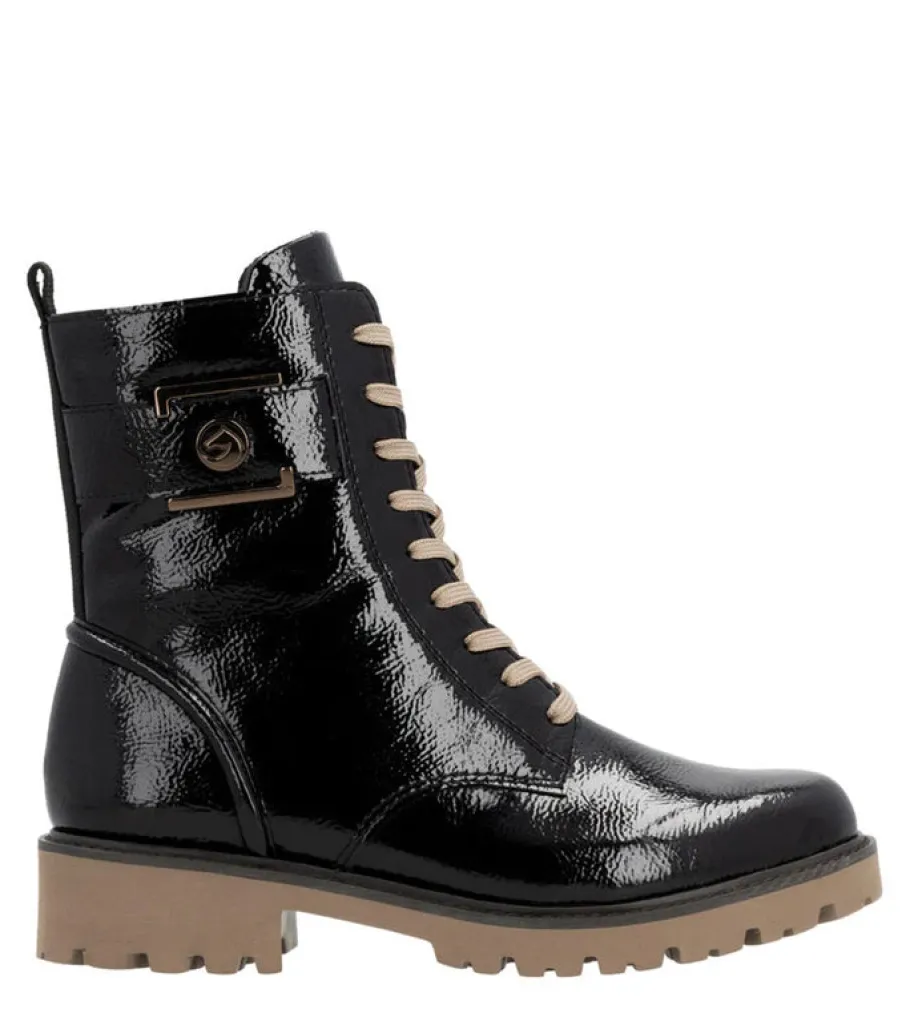 These black patent leather lace-up ankle boots Remonte have a modern look and exceptional comfort. Their practical combination of lacing and zipper makes them easy to put on, while ensuring optimum support. For a variety of looks, the laces are interchangeable.