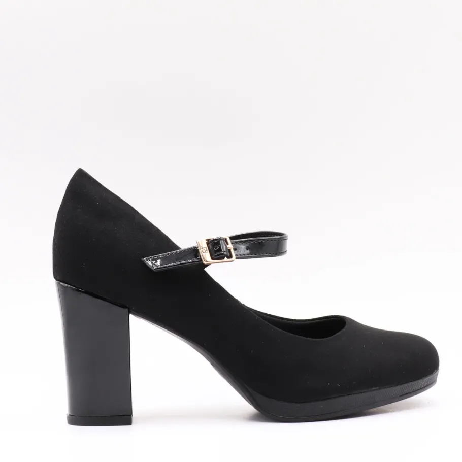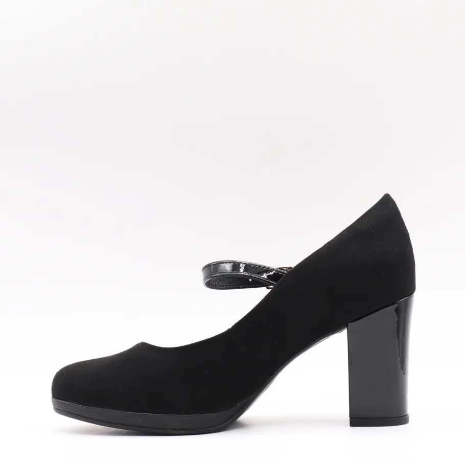 Classic style revisited. This Piccadilly pump combines elegance and comfort with its block heel and adjustable strap for optimum support. Its refined black finish and feminine allure make it a versatile shoe, ideal for both the office and formal outings.