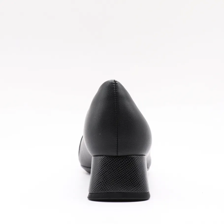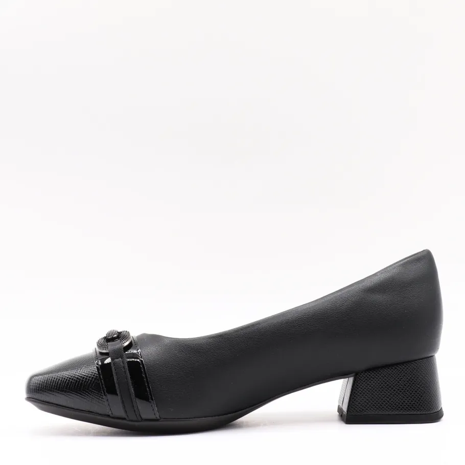 Subtle elegance and modern comfort. This black Piccadilly pump features a patent and metallic toe detail that adds a chic touch to its understated design. Its textured block heel ensures a modern look while offering stability and comfort for everyday wear. Perfect for the office or special occasions, they combine refinement and practicality.