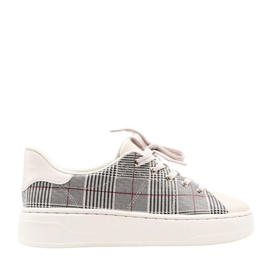 Design: tartan print, laces, white platform sole