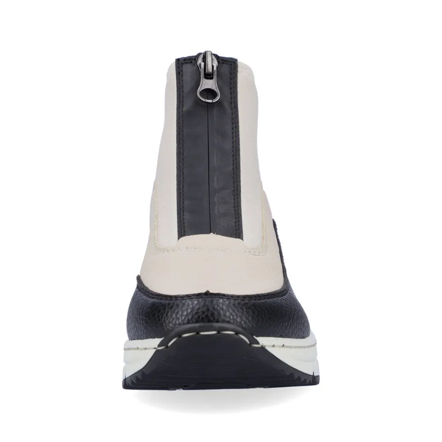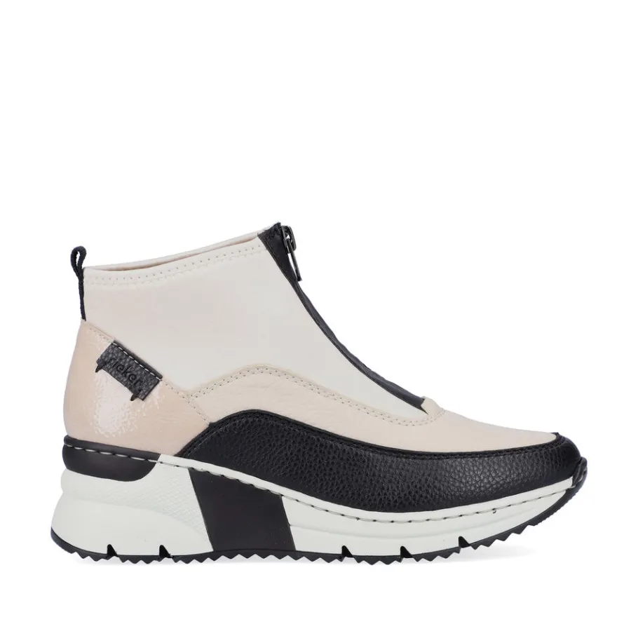 Casual and cool! These casual, articulated high-top sneakers from Rieker are comfortable companions on all your trails. Thanks to the zipper, the shoe can be put on very quickly. A cool color combination in beige, white and Black and a round toe Black offer a perfect finish and an eye-catching look. The lightweight, shock-absorbing profiled sole with a fashionable, comfortable wedge heel is an added feel-good factor. What’s more, the G comfort width gives your feet greater freedom of movement in the forefoot area. Nothing stands in the way of long walks.