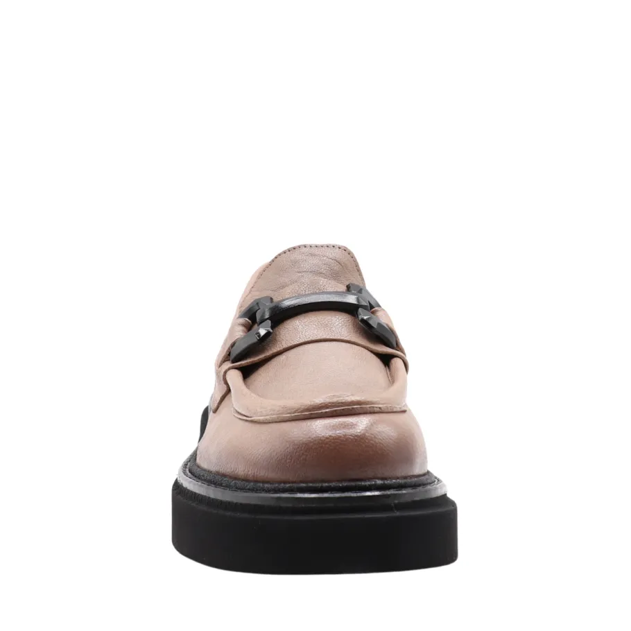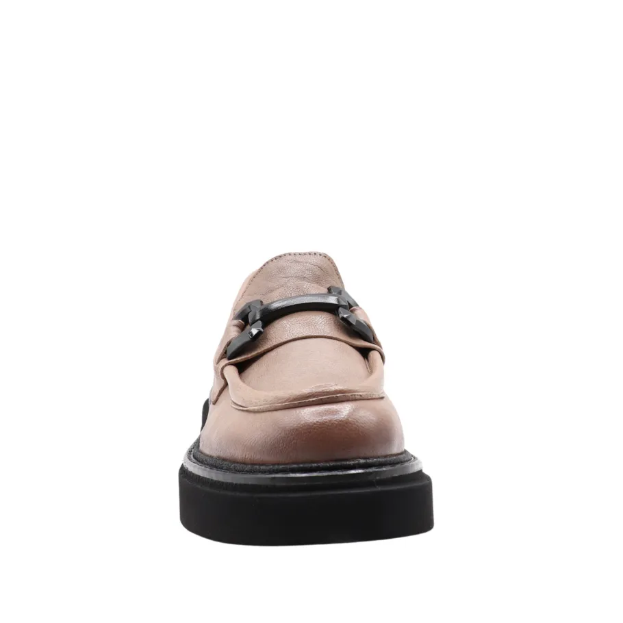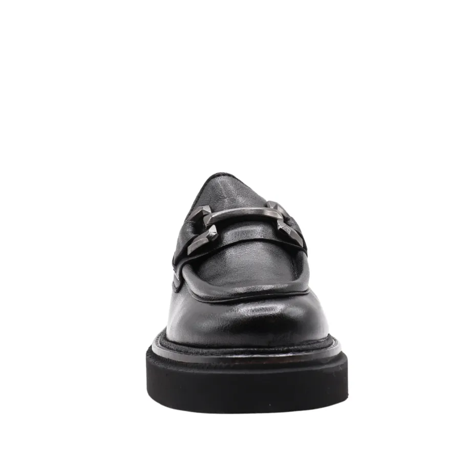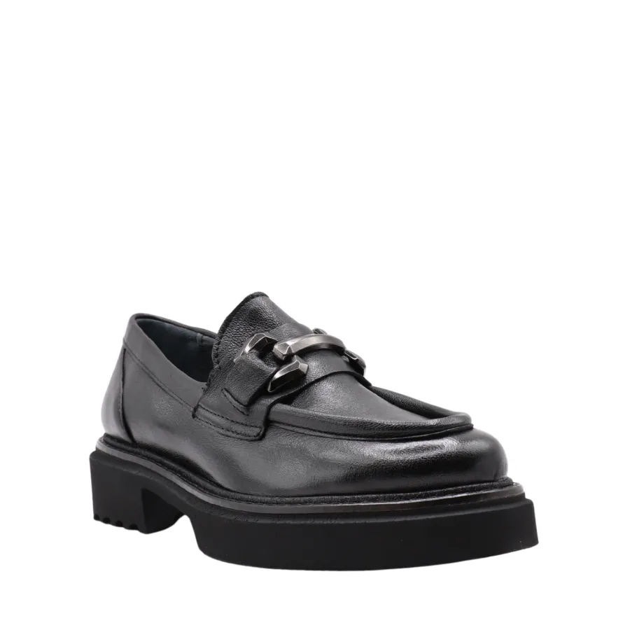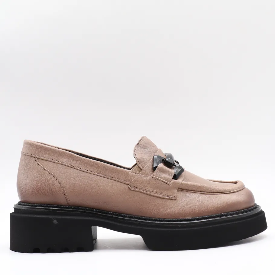 The RUTHY moccasin revisits a classic with a bold, contemporary twist. Made in Portugal from genuine leather, its sleek design is enhanced by an oversized decorative chain on the vamp, adding character and modernity.