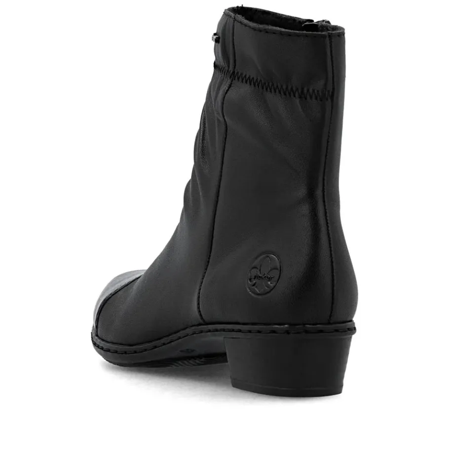 When fashion meets functionality. These black Rieker ankle boots in smooth leather are a comfortable companion. Made with stitched construction, they are sturdy, flexible and offer a perfect fit. The zipper allows for quick slip-on. The block-heel sole is both lightweight and cushioning, offering double the comfort with every step. There’s nothing to stop you taking long walks!
