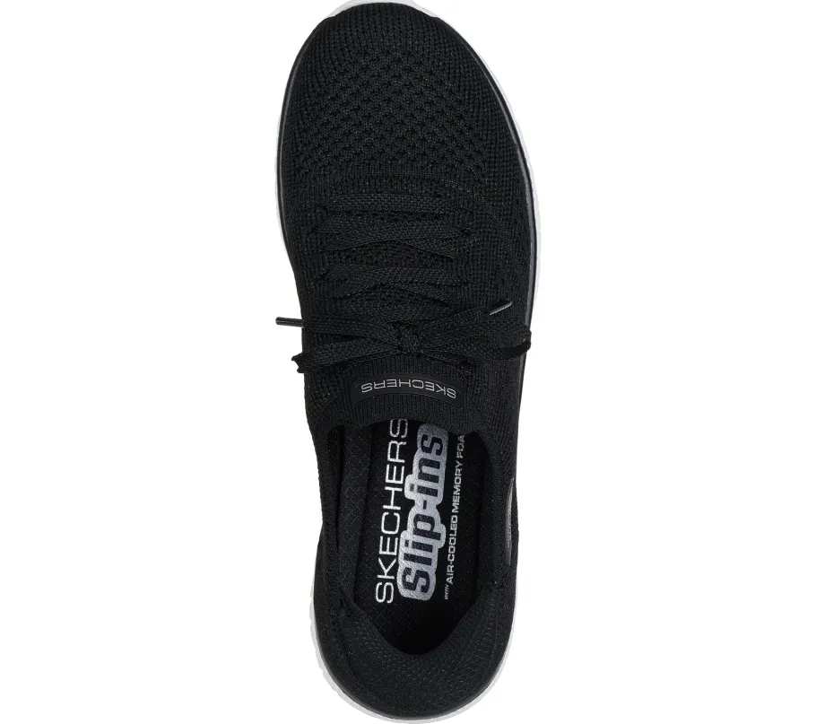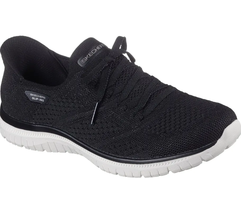 saGlide into absolute comfort with the Skechers Hands Free Slip-ins® : Virtue – Flawless. Designed with our exclusive Heel Pillow™ cushioning, this vegan model offers a Stretch Fit® stretch-knit upper with fixed laces, plus a Skechers Air-Cooled Memory Foam® insole for optimal comfort.