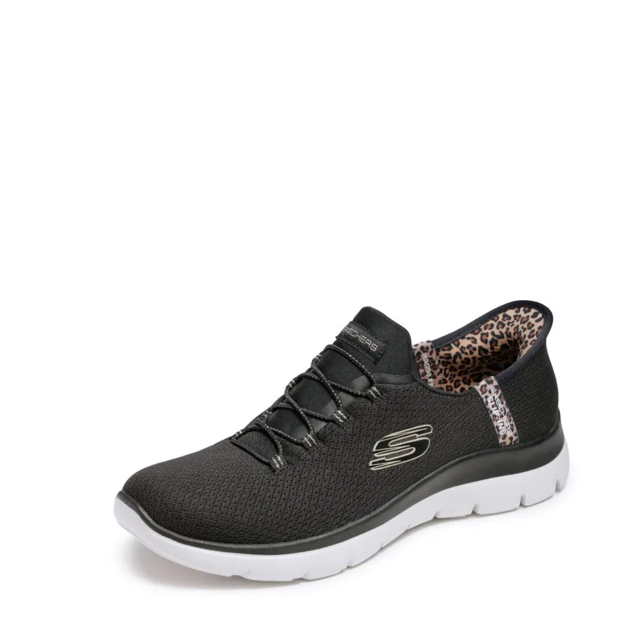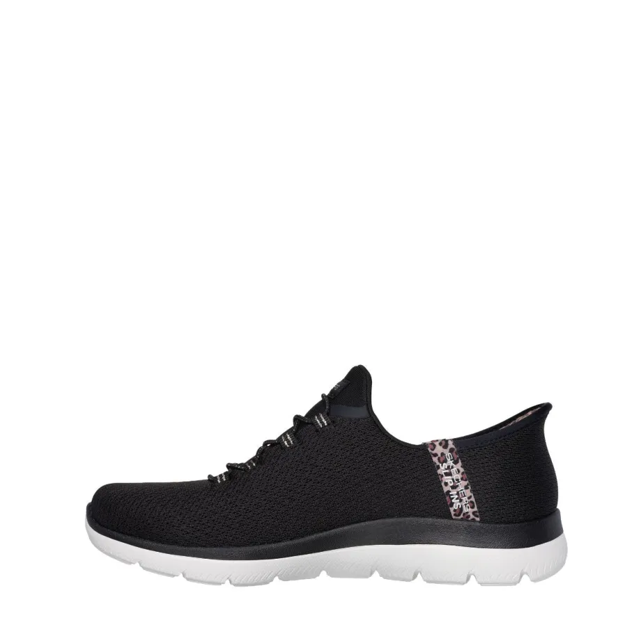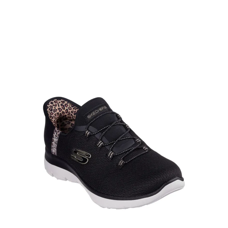 Add a touch of glamour to your step with the Skechers Slip-ins® : Summits – Leopard Chic, combining absolute comfort and effortless style. Designed with our Heel Pillow®, this vegan model features a mesh upper with leopard trim, fixed stretch laces and a comfortable Skechers Air-Cooled Memory Foam® footbed.