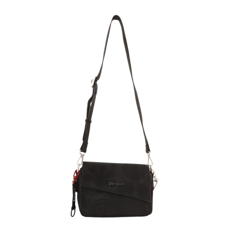 This black handbag from Desigual combines sobriety and originality thanks to its tone-on-tone floral or mandala motif, subtly embossed on the flap and body of the bag. Its classic rectangular shape is enhanced by modern details, making it a versatile accessory for all occasions.