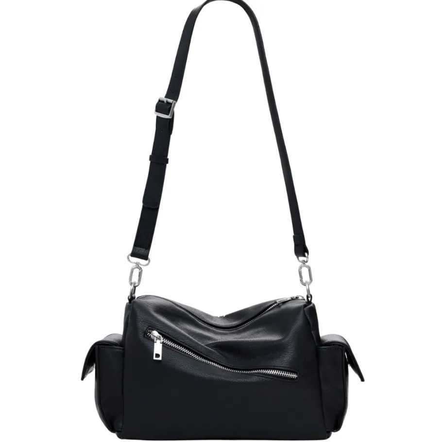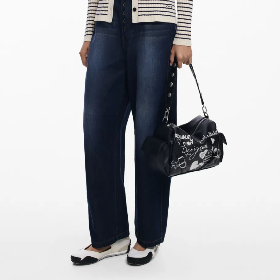 Medium bowling bag in plain leather-effect fabric with handwritten scribble-style print.