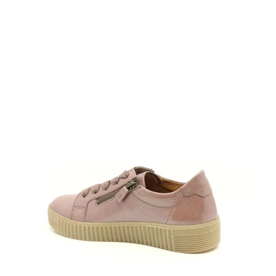 Combine style, comfort and responsibility with this trendy Gabor platform sneaker. Crafted in resource-efficient tan patent leather, it features a textured finish, wide tonal laces and a practical side zipper. Its removable insole, with cushioning made from recycled materials from Gabor’s own production, offers enhanced comfort while remaining sustainable. Easy to remove, it also allows the use of orthopedic insoles or offers more volume depending on your needs. The genuine leather lining ensures a breathable, foot-friendly environment, while the 3.5 cm platform sole discreetly elongates the silhouette.