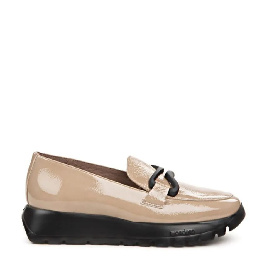 Add a modern, refined touch to your outfits with these platform loafers by Wonders. Crafted from quality patent leather in an elegant beige hue, they feature matte black trim on the vamp, providing a graphic contrast. Their 35 mm rubber outsole offers comfort and stability, while the removable leather insole with memory gel ensures optimal cushioning all day long. Lined with leather and textile, these moccasins combine contemporary style with exceptional comfort, for a polished look every day.