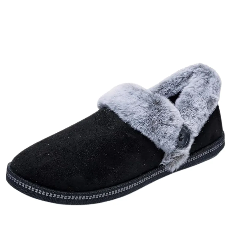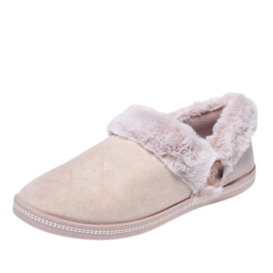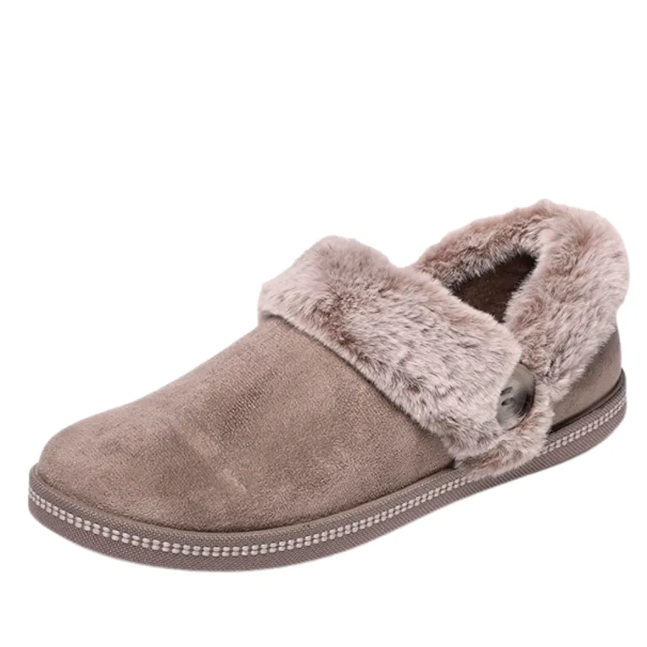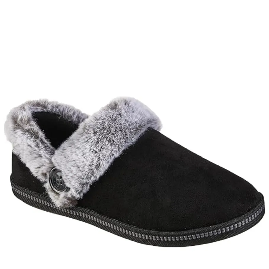 - Contrast faux fur collar and instep trim