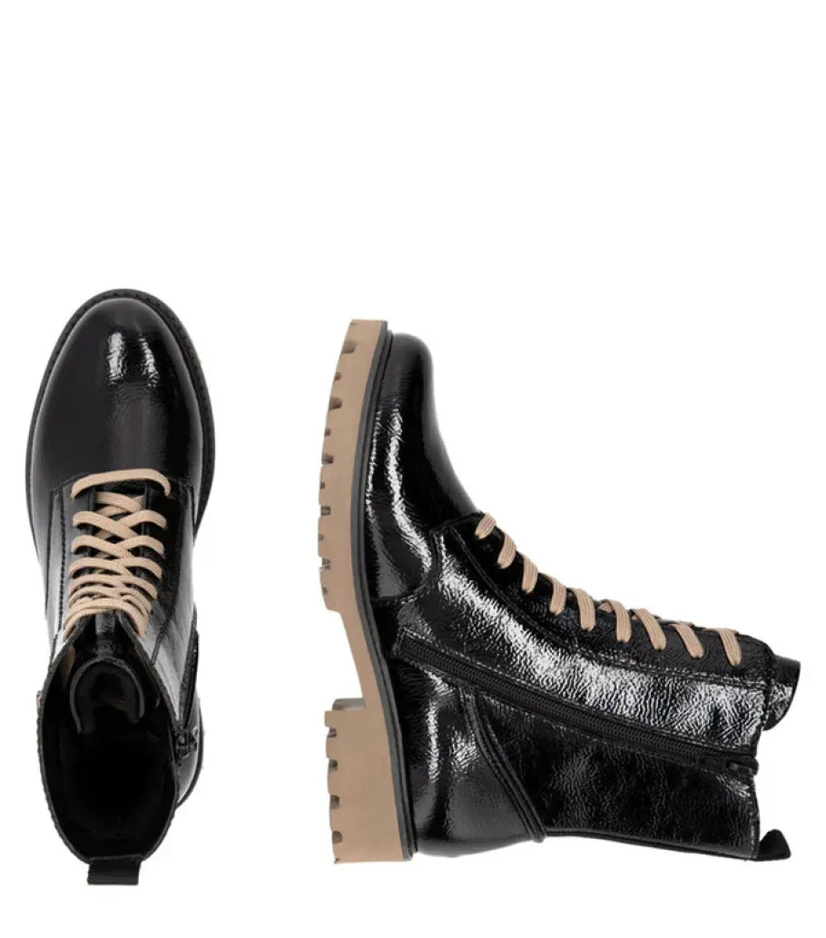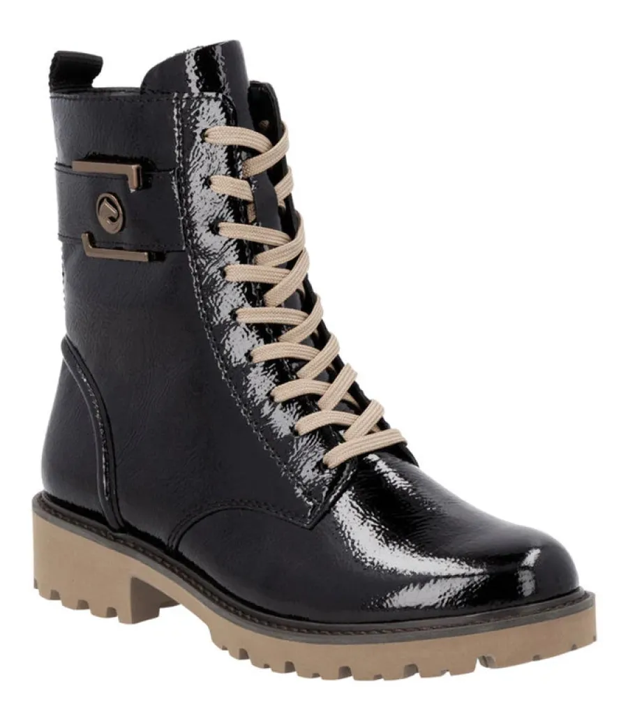 These black patent leather lace-up ankle boots Remonte have a modern look and exceptional comfort. Their practical combination of lacing and zipper makes them easy to put on, while ensuring optimum support. For a variety of looks, the laces are interchangeable.