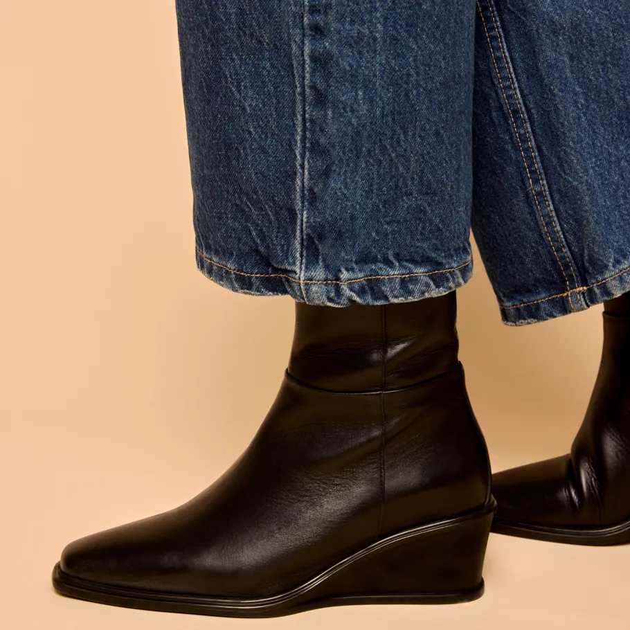 Isabella boots by Apropo combine elegance and comfort thanks to their minimalist design and wedge sole. Crafted in genuine leather, they feature a streamlined silhouette and a flattering height that elongates the leg while remaining comfortable to wear. A side zipper ensures practicality and support.