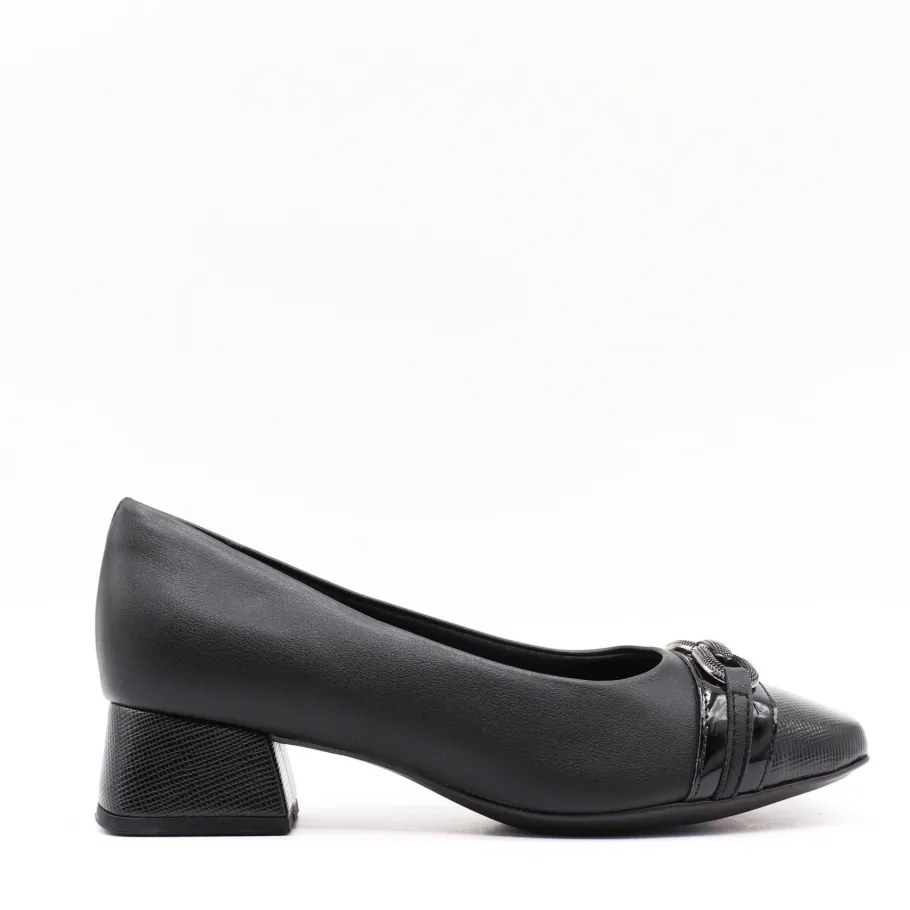 Subtle elegance and modern comfort. This black Piccadilly pump features a patent and metallic toe detail that adds a chic touch to its understated design. Its textured block heel ensures a modern look while offering stability and comfort for everyday wear. Perfect for the office or special occasions, they combine refinement and practicality.