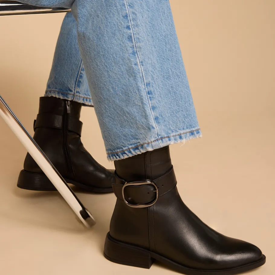 Elegant and timeless, Margot ankle boots by Apropo Margot boots are a seasonal essential. Crafted in genuine leather, they feature a large metal buckle that adds a modern, refined touch to their sleek silhouette. The internal zipper ensures quick slip-on, while their low block heel guarantees optimal everyday comfort.