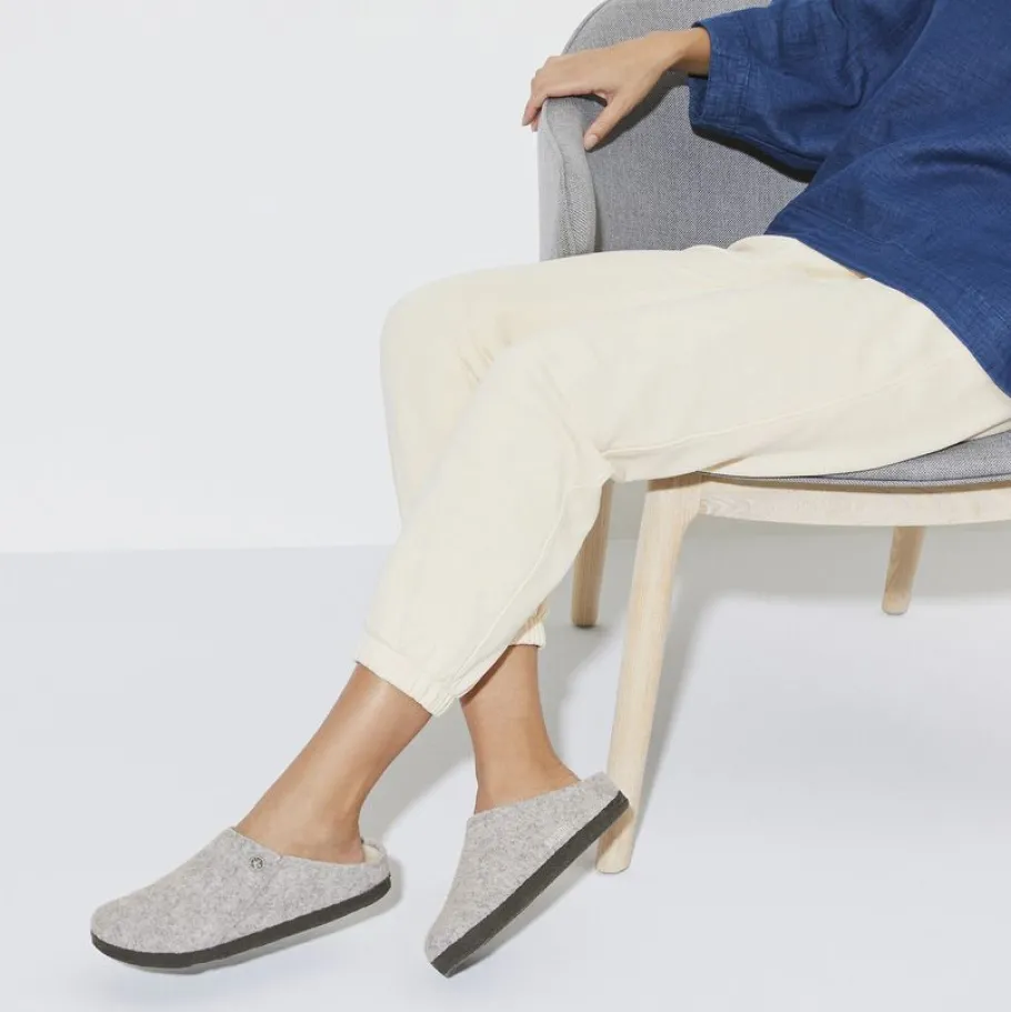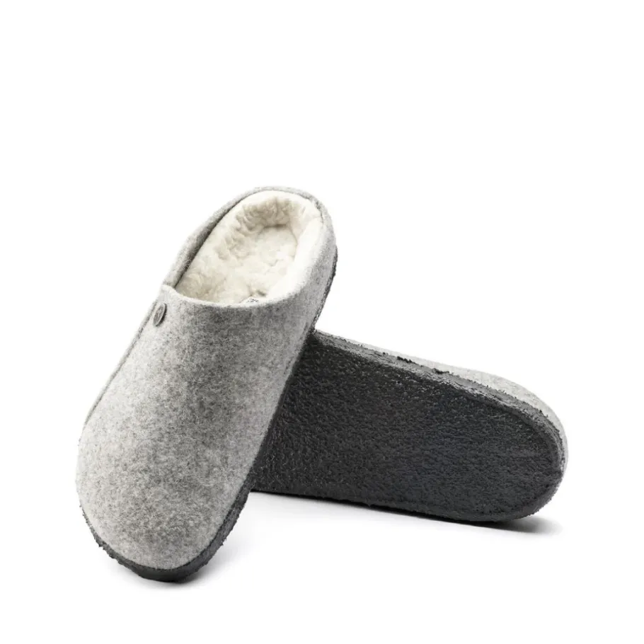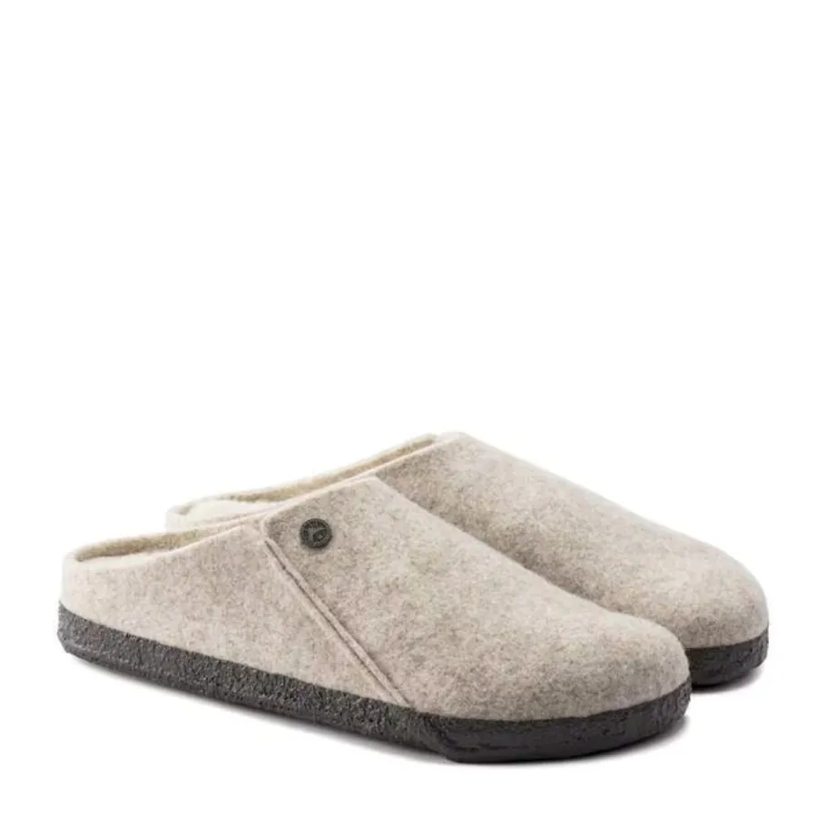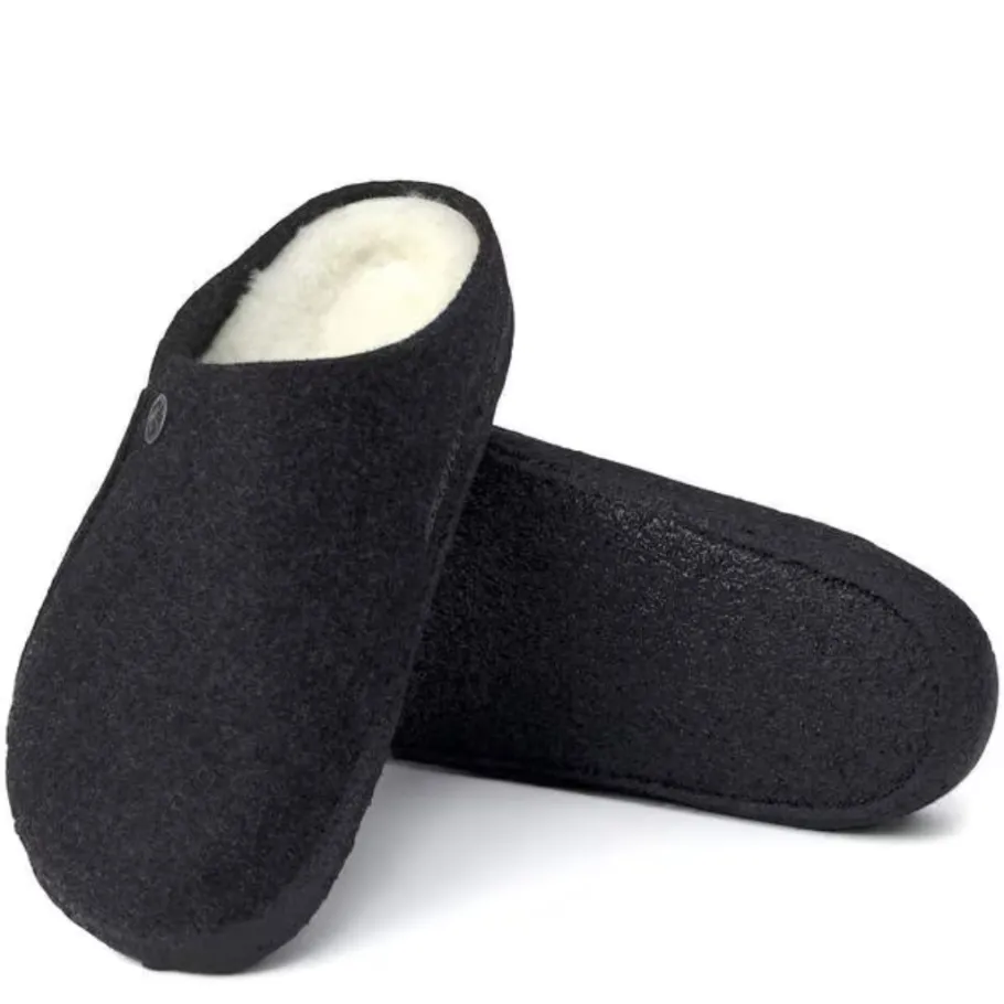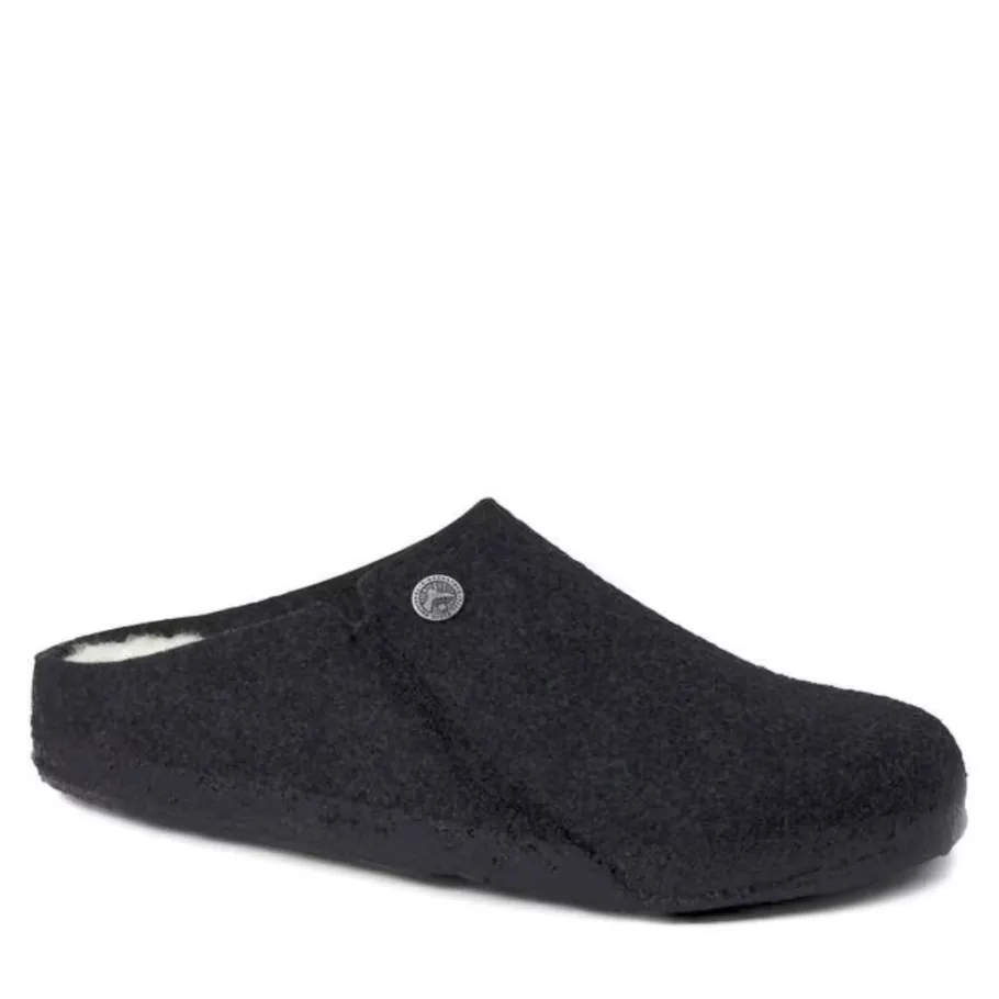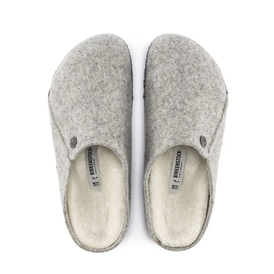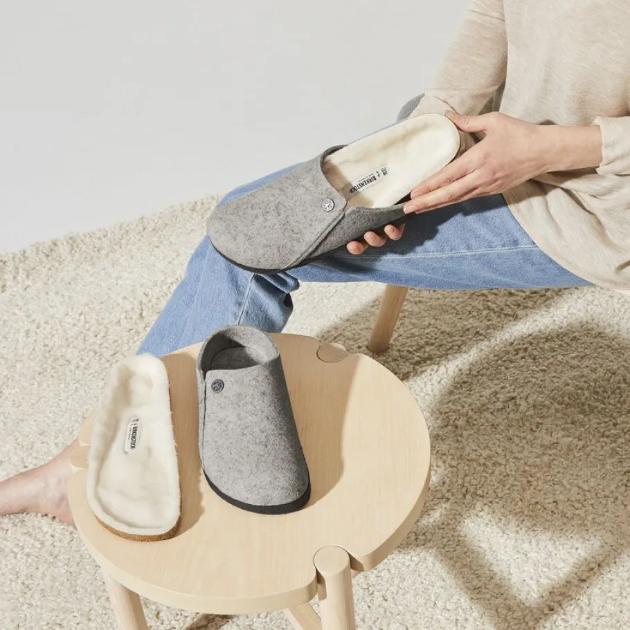 The BIRKENSTOCK Zermatt is our first real slipper. It features our iconic cork latex insole and, to keep you warm, is fully lined with genuine sheepskin that will keep your feet warm all winter long. The upper is made of soft real wool.